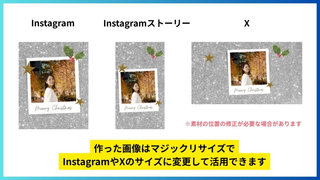 例えば添付の図に示すように、Instagramの投稿をX向けに瞬時に変更したり、Instagramのストーリー用にサイズを一括で調整したりといった作業が一瞬で完了します。