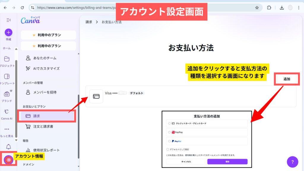 支払い情報の登録は、Canvaのアカウント設定から簡単に行えます。
