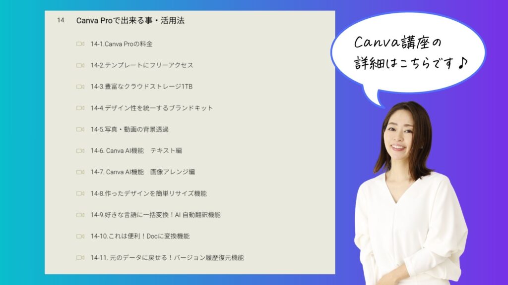 CanvaProで出来る事・活用法のレッスンの詳細は、次の通りです。