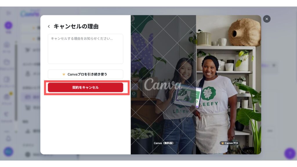 「20○○年○月○日を過ぎると、Canvaプロにアクセスできなくなります」と記載されていれば解約完了です。