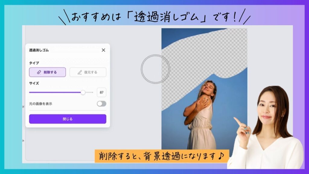 現在、Canva Proの背景機能は以下の3つがあります 。※透過消しゴムは無料プランでも使えるようになりました。