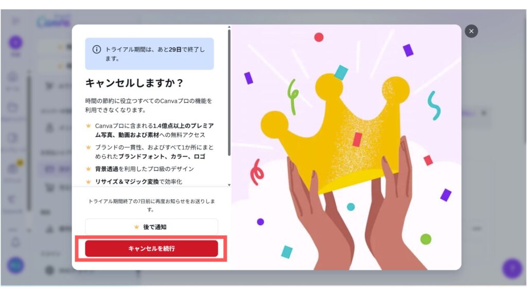 『キャンセルを続行』ボタンをクリックします。