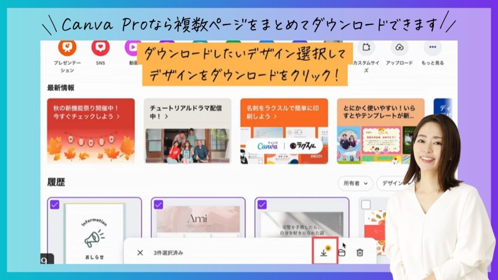 Canva Proはホーム画面の『自分のデザイン』一覧から、作成した複数のデザインファイルをまとめて選択し、一度にダウンロードできます。