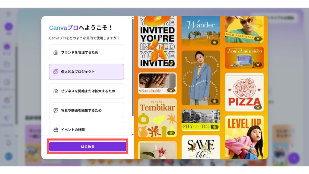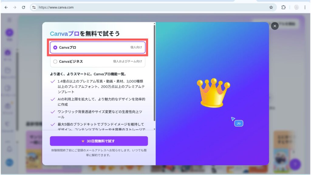 まずは、30日間の無料トライアル期間でCanva Proを体験してみるのがおすすめです。