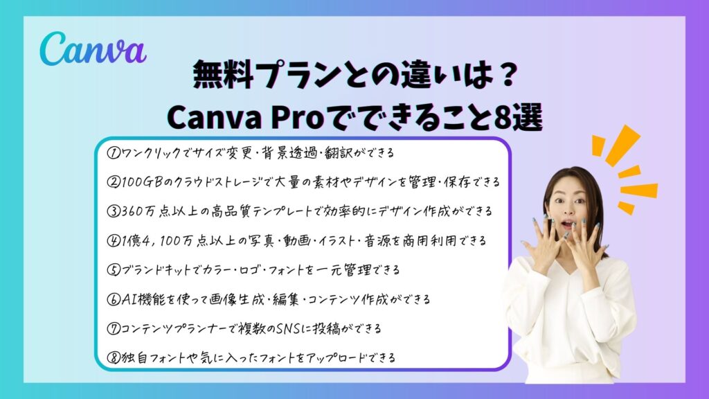 ここでは、無料プランとの違いやCanvaProでできること8つをご紹介します。