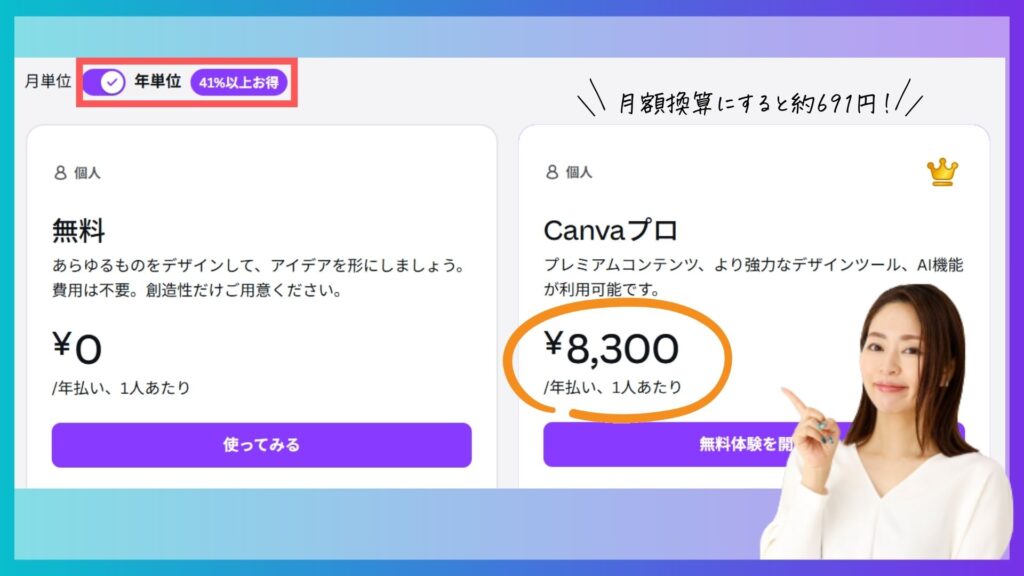 次にCanvaProの年単位の料金は8,300円で、月額換算にすると約691円となっています。