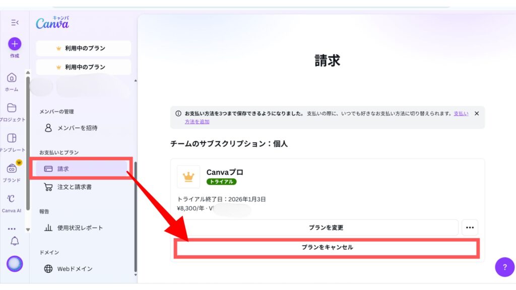 Canva側でクレジットカードなどを登録している場合は、Web版Canvaの「設定」→「支払いとプラン」から変更できます。