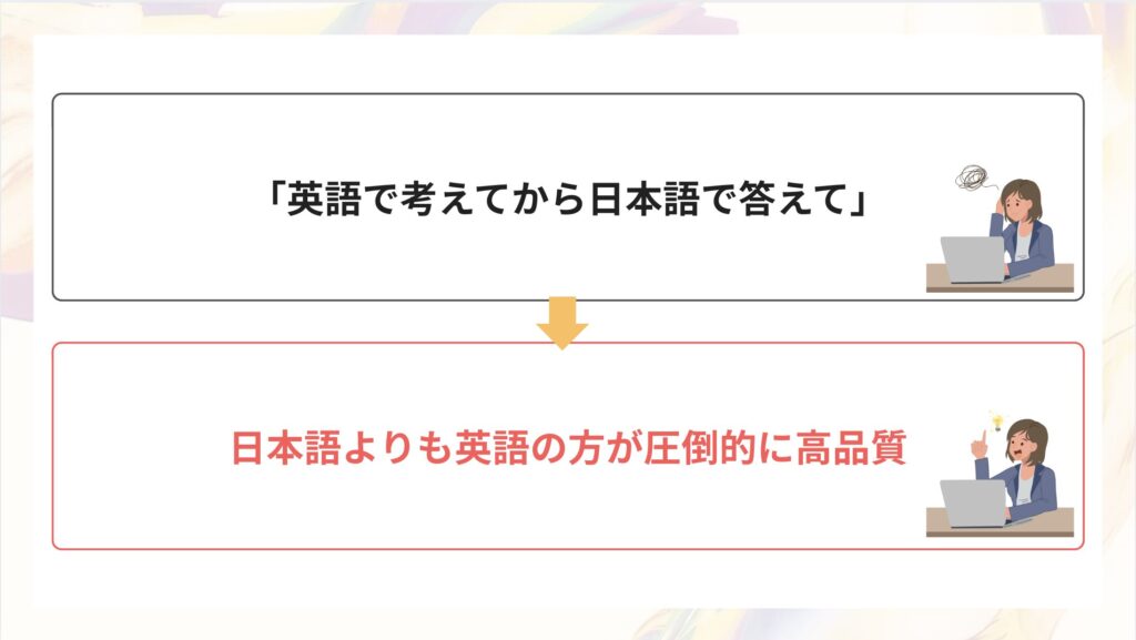 「英語の巨大なデータベース」を使って高度な推論を行わせてから、最後に日本語に翻訳させることで、日本語だけで考えるよりも論理的で正確な回答が得られます。