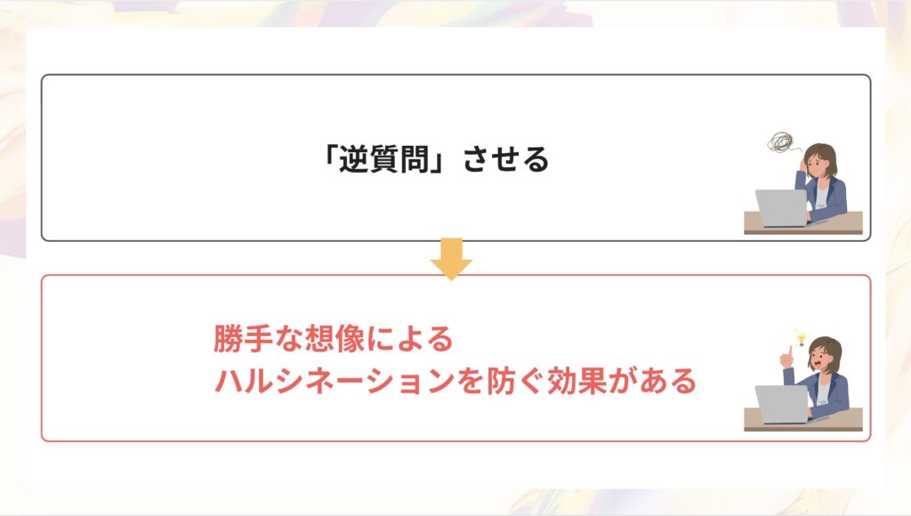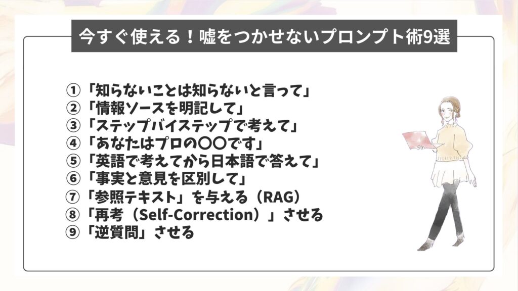| 【ステップ1】嘘をつかせないプロンプト術9選 | ・知らないことは知らないと言って ・情報ソースを明記して ・ステップバイステップで考えて ・あなたはプロの〇〇です ・英語で考えてから日本語で答えて ・事実と意見を区別して ・「参照テキスト」を与える(RAG) ・「再考(Self-Correction)」させる ・「逆質問」させる |