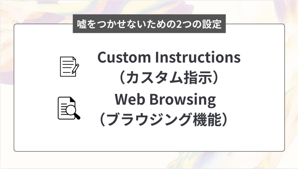 | 【ステップ2】嘘をつかせないための2つの設定 | ・Custom Instructions(カスタム指示) ・Web Browsing(ブラウジング機能) |