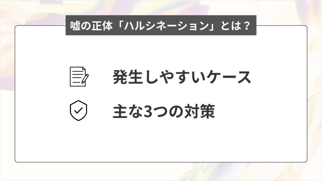 | そもそもChatGPTはなぜ嘘をつくのか? | ・嘘の正体「ハルシネーション」とは? |