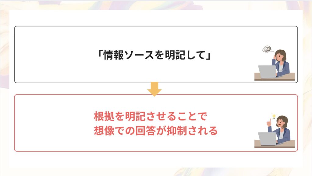 最もシンプルかつ強力な指示です。ChatGPTは「確率的に次の言葉をつなげる」という性質上、答えがわからない場合でも、もっともらしい回答を無理やり生成してしまうことがあります。