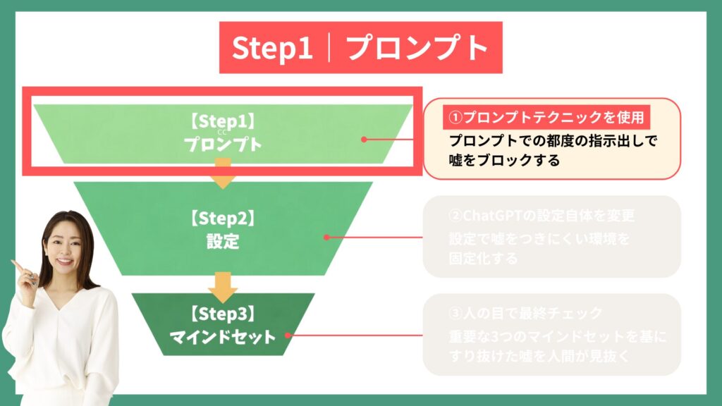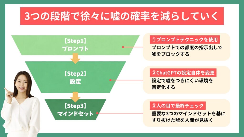 この記事では、「ChatGPTに嘘をつかせないための仕組みと方法」について、3つのステップ形式で以下の内容を詳しく解説します。