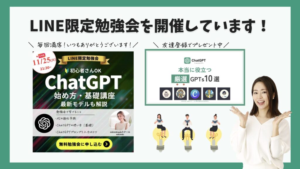公式LINEでは「ChatGPT本当に役立つ厳選GPTs10選」や「画像生成おすすめプロンプト集」を無料プレゼント中。最新のAIトレンドや限定勉強会の情報もお届けしています。