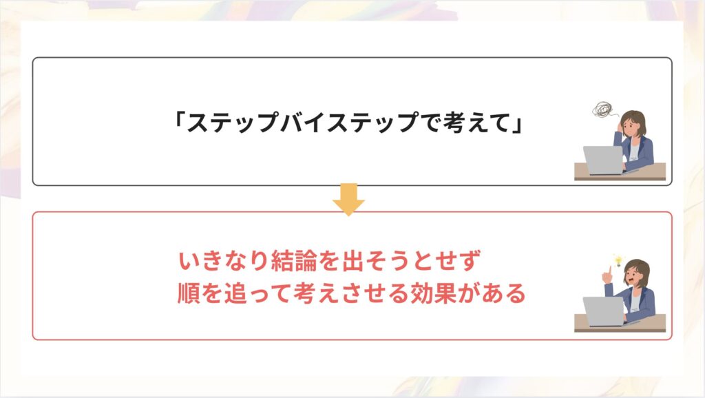 「ステップバイステップで」と指示することで、いきなり結論を出そうとせず、順を追って考えさせる効果があります。これは専門用語で 「Chain of Thought(思考の連鎖)」 と呼ばれるテクニックです。