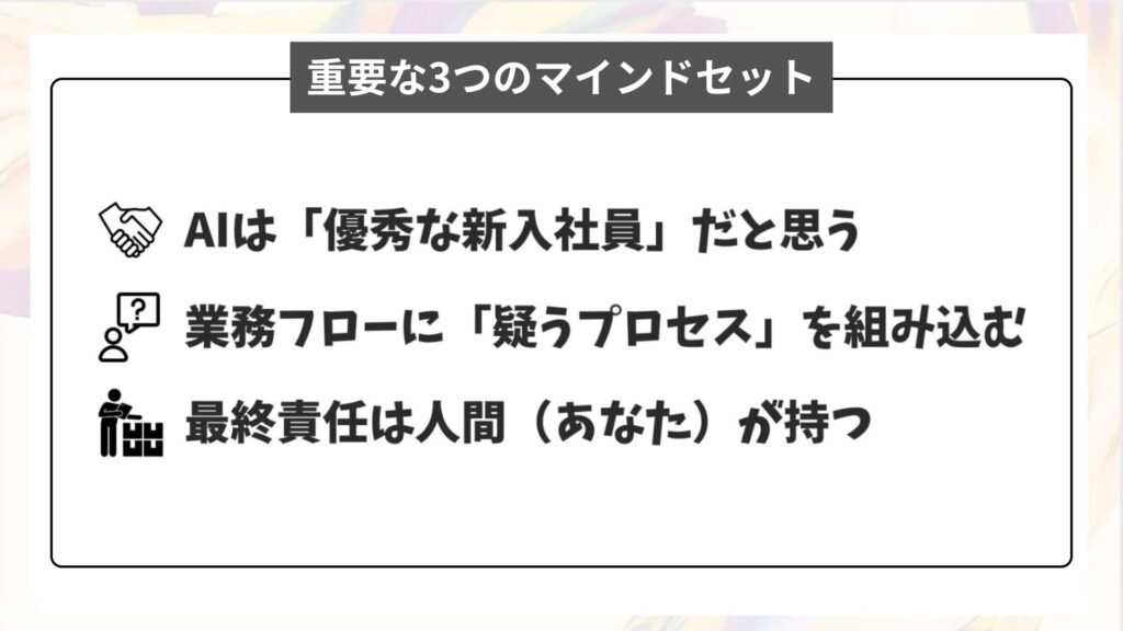 | 【ステップ3】最終責任は人間が持つ!重要な3つのマインドセット | ・AIは「優秀な新入社員」だと思う ・業務フローに「疑うプロセス」を組み込む ・最終責任は人間(あなた)が持つ |