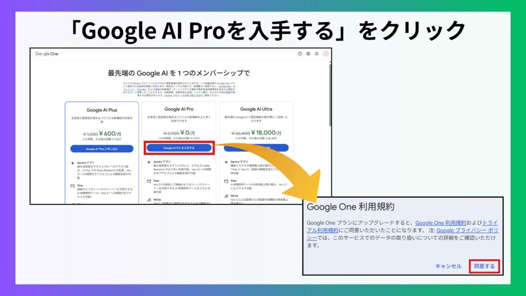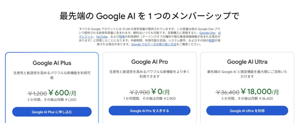 - 個人向け:無料プラン+Google AI Plus / Pro / Ultra(サブスク型)