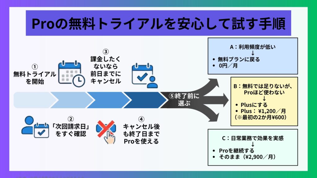 まずは無料プランで使い心地を確認し、制限が気になってきたタイミングでPlusやProを検討する流れなら、無駄な課金を避けながら失敗しにくくなります。特にProは無料トライアルを活用して、実務での効果を試してから判断するのがおすすめです。