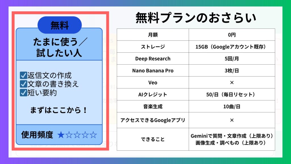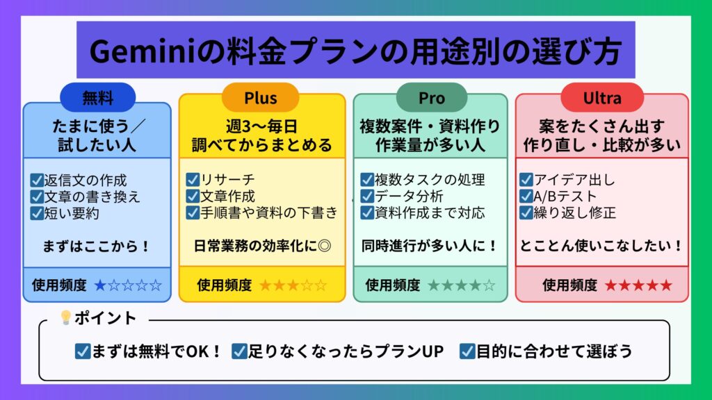 なお、「どのプランを選べばよいか」については、「Geminiの料金プランはどれがいい?無料・Plus・Pro・Ultraの選び方」の章で、利用目的や作業量に応じたおすすめを詳しく解説しています。