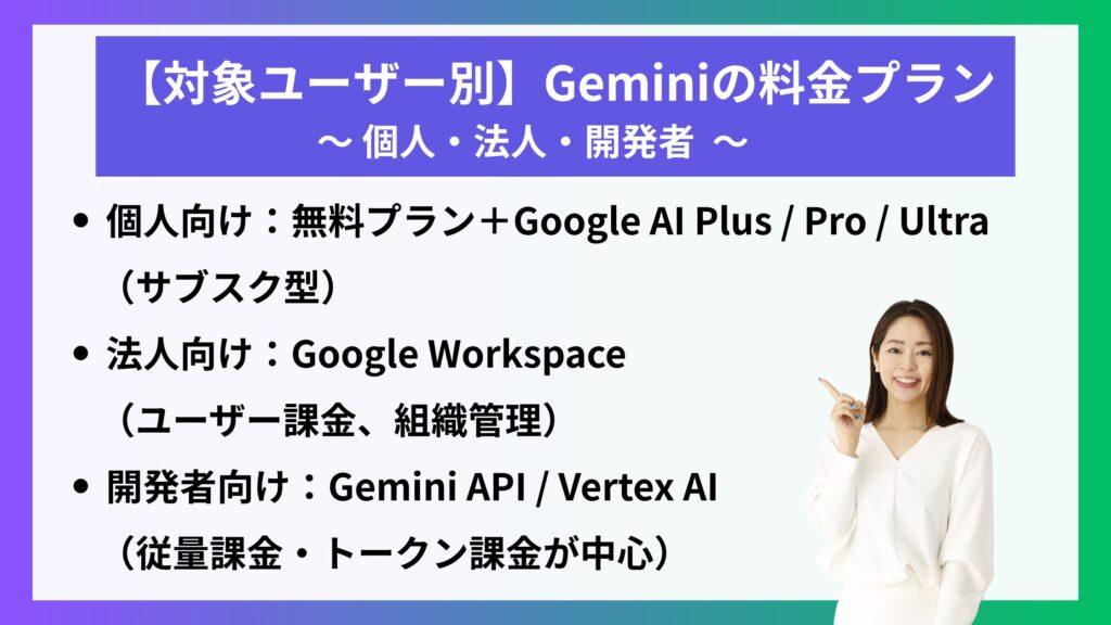 【対象ユーザー別】Geminiの料金プラン|個人・法人・開発者
