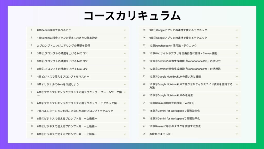 「Geminiをもっと実務で使えるようになりたい」と感じた方は、Gemini講座をぜひチェックしてみてください。