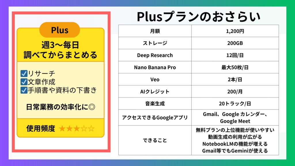 「作業時間を短くしたい(Geminiで時短したい)」ならGoogle AI Pro。Geminiの機能については個人向けプランの章で紹介しているので参考にしてみてくださいね。