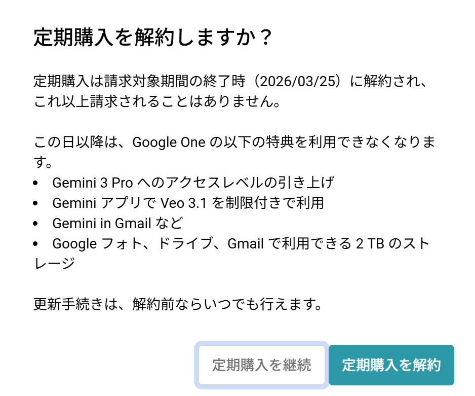 Google One(2TB) Google AI Pro 月額 1,450円/月 2,900円/月 ストレージ 2TB 2TB このプランの考え方 「容量を増やす」が中心 「容量+GeminiなどAI機能」までまとめて使う 家族と共有 最大5人まで共有できる(追加料金なし) 最大5人まで共有できる(追加料金なし)+ファミリーメンバーもAI特典が使える 向いている人 写真・動画・ドライブが増えて、とにかく容量が足りない人