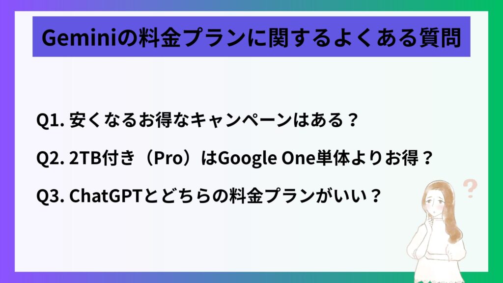 Geminiの料金プランに関するよくある質問を以下の3つご紹介します。