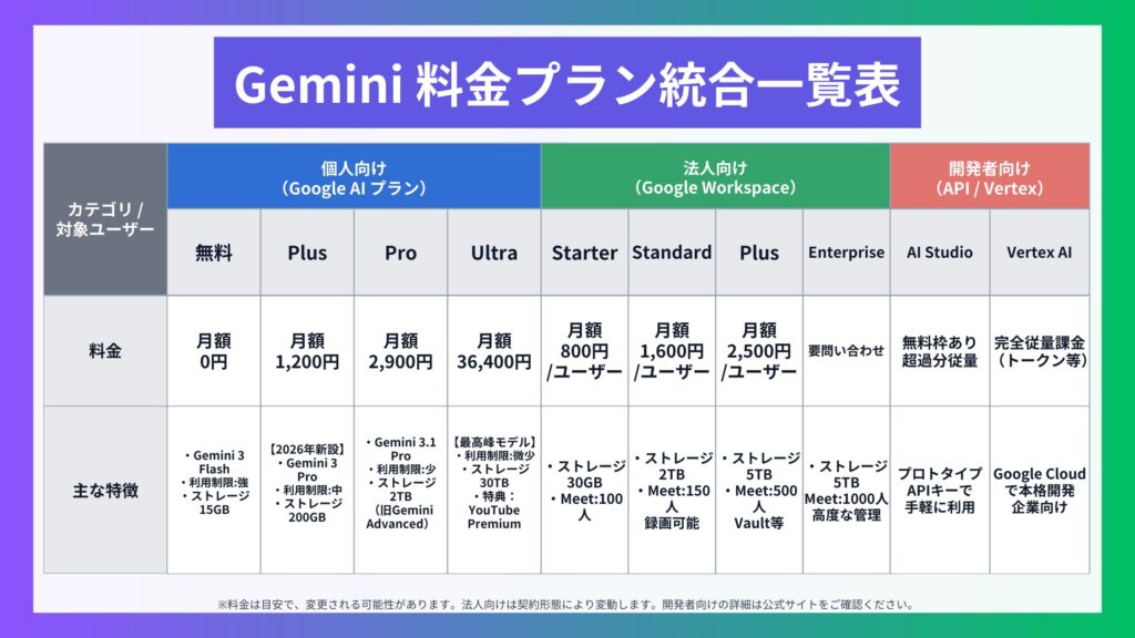 「Geminiの料金プラン」といっても、実は 個人 / 法人 / 開発者 で料金体系がかなり違います。