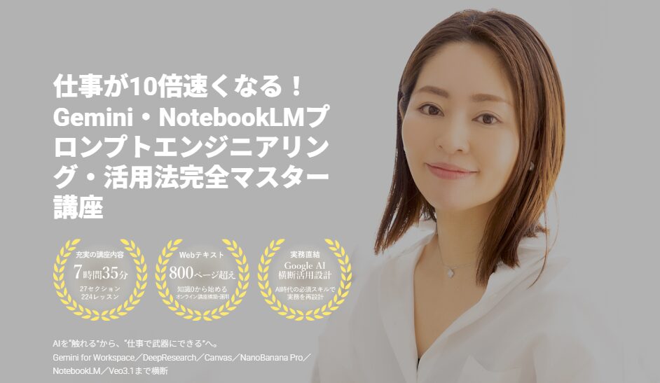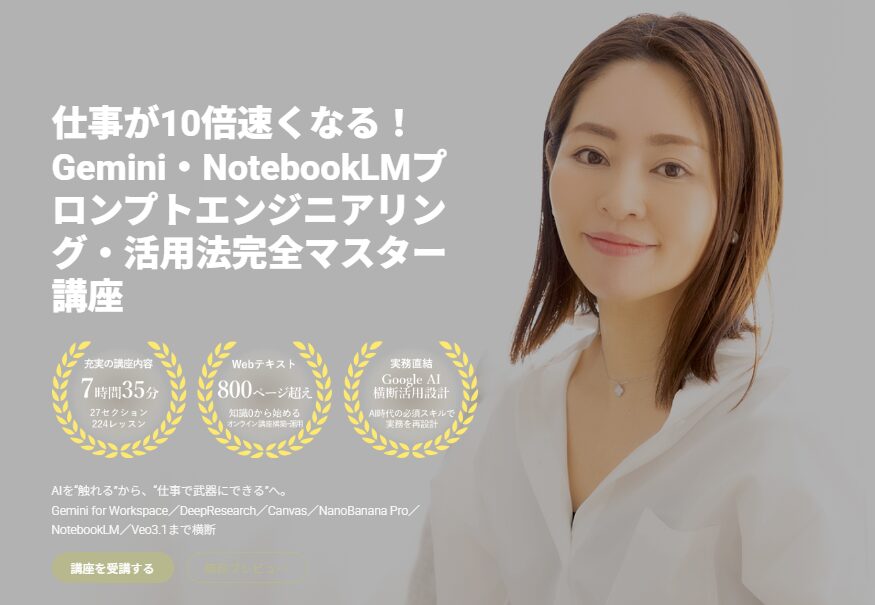 講座内容は27セクション224レッスン+800ページ超の資料。Geminiを含めたGoogle AIを体系的に学びたい方は、「仕事が10倍速くなる!Gemini・NotebookLMプロンプトエンジニアリング・活用法完全マスター講座」をぜひチェックしてみてください。
