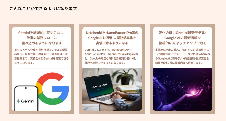 そんな疑問から生まれた本講座では、Geminiの基礎からプロンプト設計のコツ、Gemini for Workspaceの業務活用、NotebookLM・DeepResearch・NanoBanana ProなどGoogle AIツールの使い方まで体系的に学ぶことができます。Google AIは進化のスピードが非常に速いため、新機能や最新モデルの情報も随時講座に反映し、継続的に最新のGoogle AI活用法をキャッチアップすることができます。