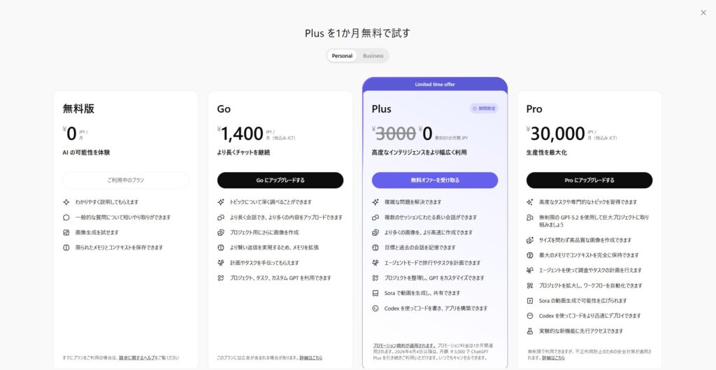 ChatGPTには、無料版のほかに Go / Plus / Pro などの有料プランがあります。