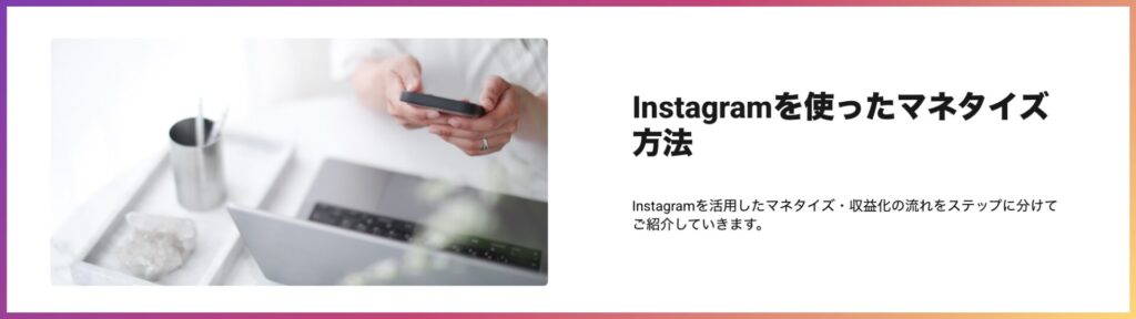 また、ジャンル選びだけでなくマネタイズにつなげる考え方も解説しているため、インスタで稼ぐことを目指している方にはぜひ学んでいただきたい内容です。