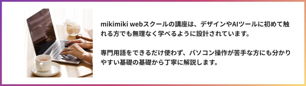 mikimiki webスクールでは、Instagramのアカウント設計をはじめ、デザインからマネタイズ方法、AIを活用した運用テクニックまで幅広く学ぶことができるインスタ講座をご用意しています。インスタを学び始めたいとお考えの方は、ぜひこちらもご覧ください。
