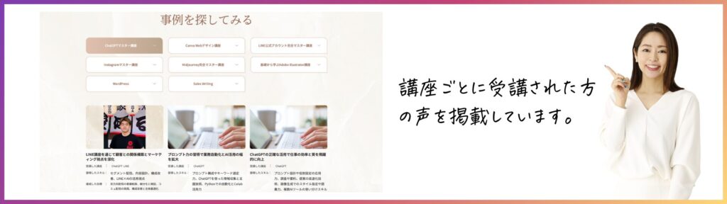 初心者の方から、すでにインスタを運用している方まで、実践的に活かせる講座となっています。インスタで集客や収益化に繋げたい方におすすめの内容です。