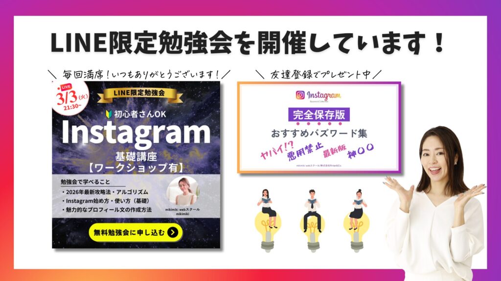 もし、整理できずに立ち止まってしまった場合は、mikimiki webスクールインスタ講座で基礎から一緒に学んでいきましょう。