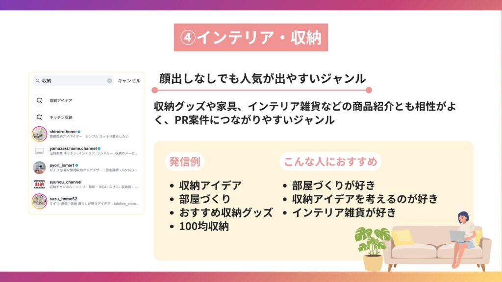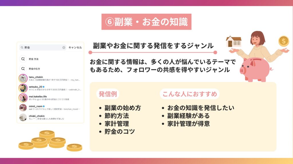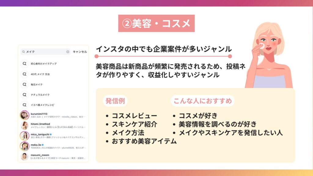 インスタで稼ぎやすいジャンルには、次のようなものがあります。