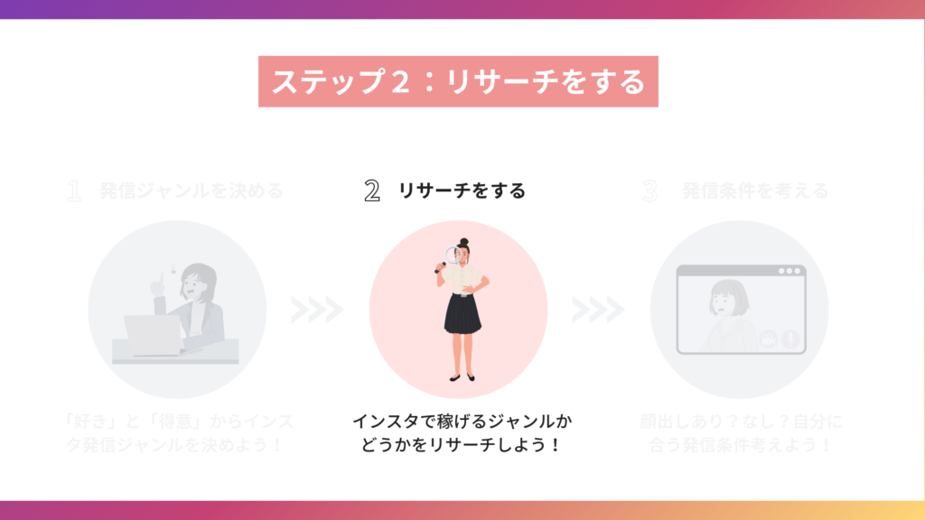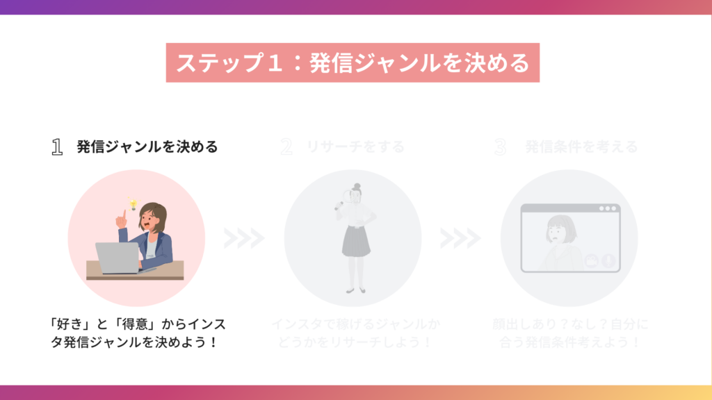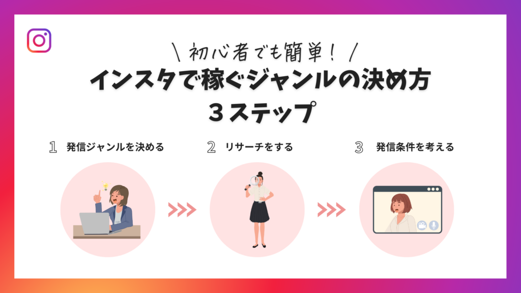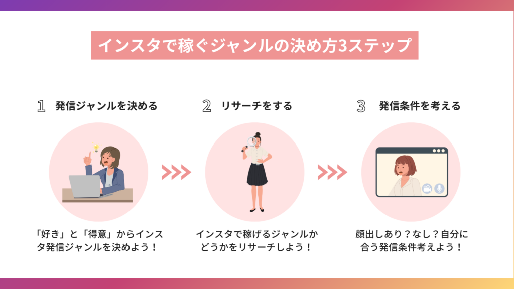 インスタで稼ぐジャンルの決め方は、わかりやすい3ステップで解説しています。