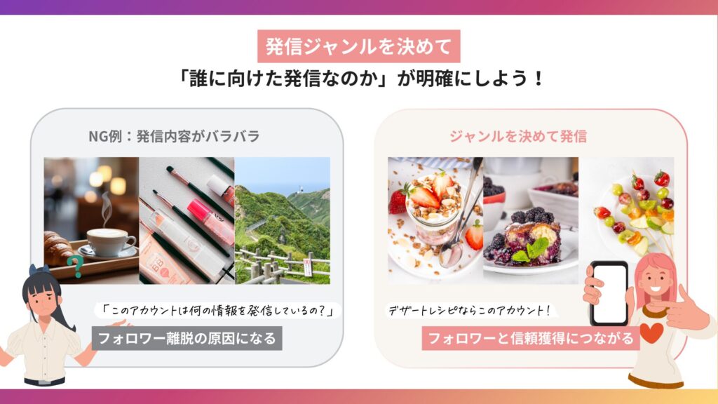 ジャンルを決めずに投稿を始めてしまうと、投稿内容がバラバラになり、届けたい相手に発信内容が届きにくくなります。