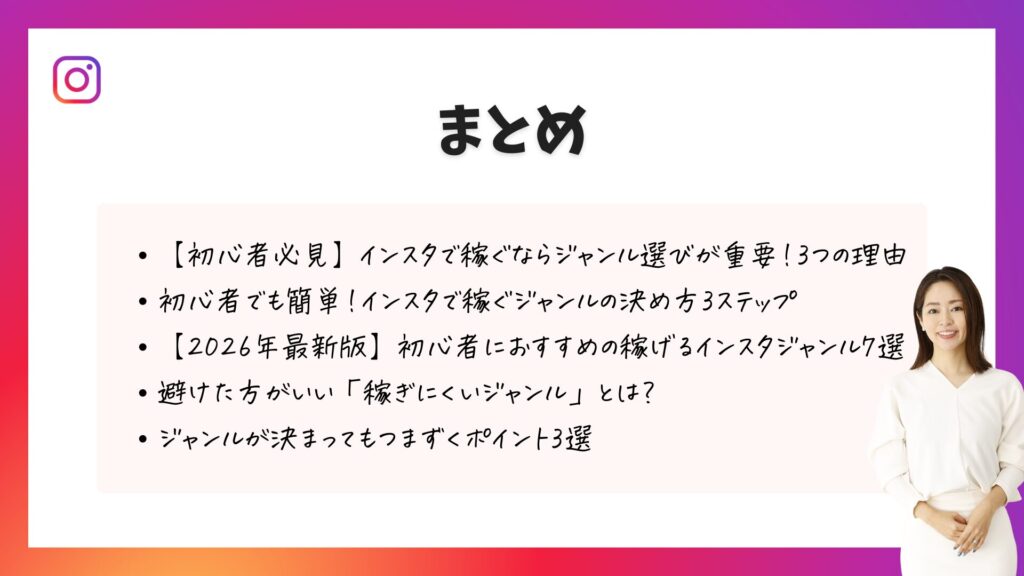 この記事を読むと、自分に合ったジャンルが決まり、インスタ収益化への第一歩を踏み出せるはずです。