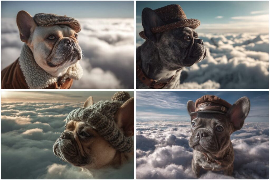 (帽子をかぶったフレンチブルドッグ、雲の上)