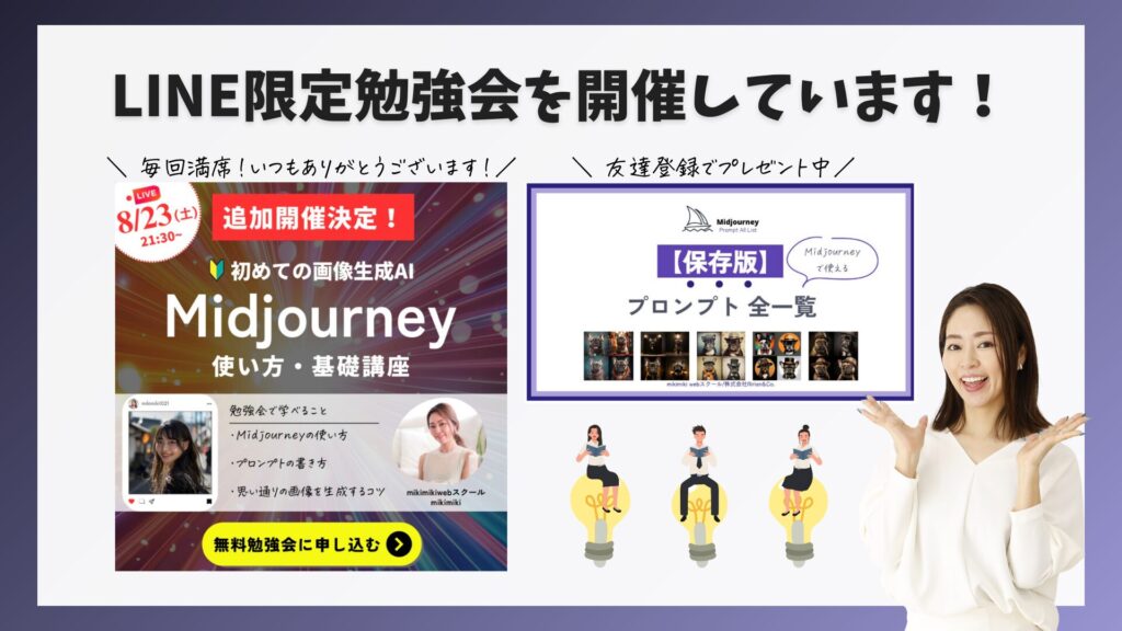 現在、mikimiki webスクールの公式LINEを友達登録していただくと、【保存版】Midjourneyで使えるプロンプト全一覧をプレゼントしています。この記事で紹介していないプロンプトも含まれています。気になる方はぜひこちらからご登録ください。