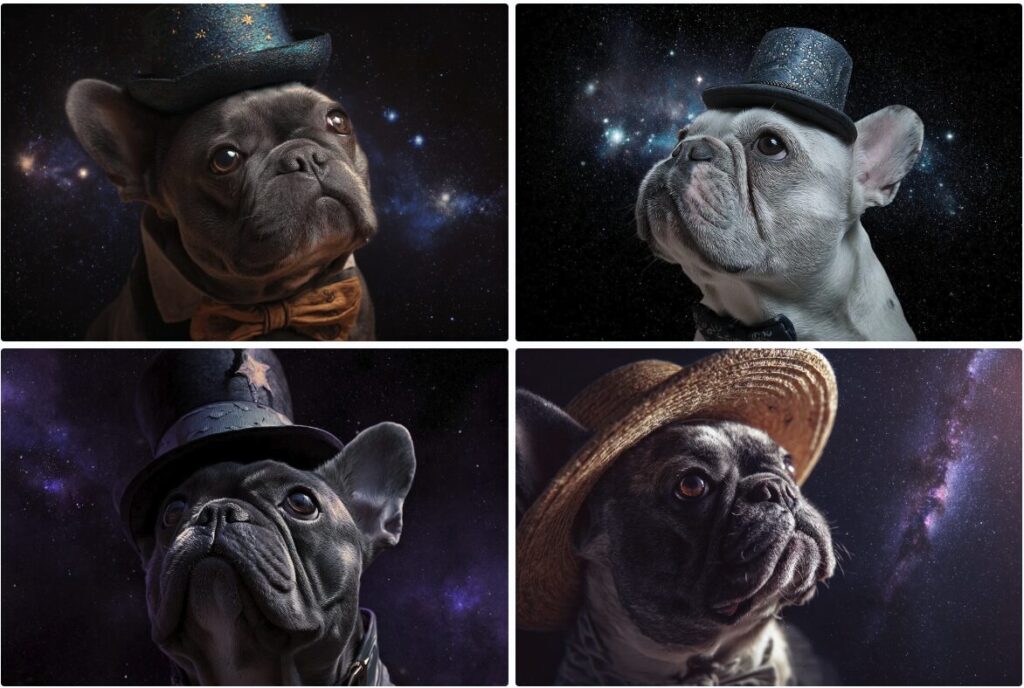 (帽子をかぶったフレンチブルドッグ、宇宙空間)