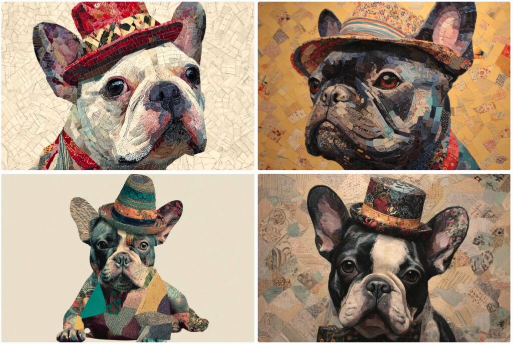 (帽子をかぶったフレンチブルドッグ、パッチワークコラージュ)