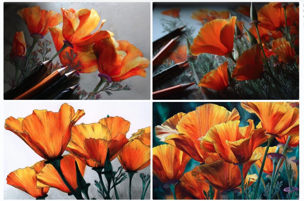 上の2枚の画像で、花と一緒に色鉛筆が描かれてしまいました。プロンプトが長すぎて、「色鉛筆で描く」という指示が「色鉛筆も一緒に描く」と解釈されてしまったのです。