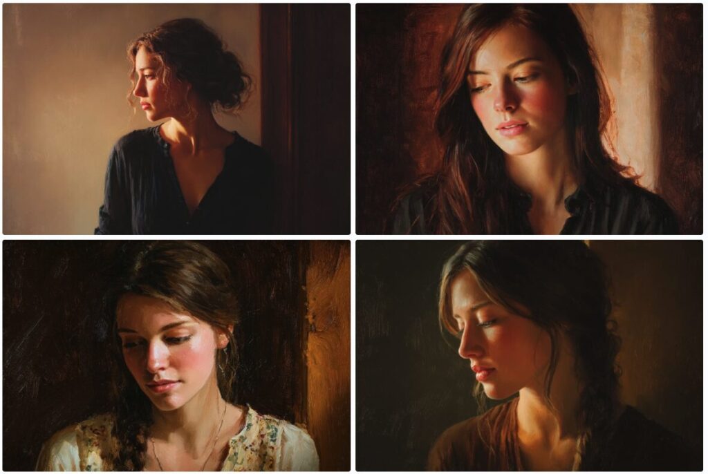 「Portrait of a woman, oil painting, indoor, soft lighting, warm colors, calm mood」