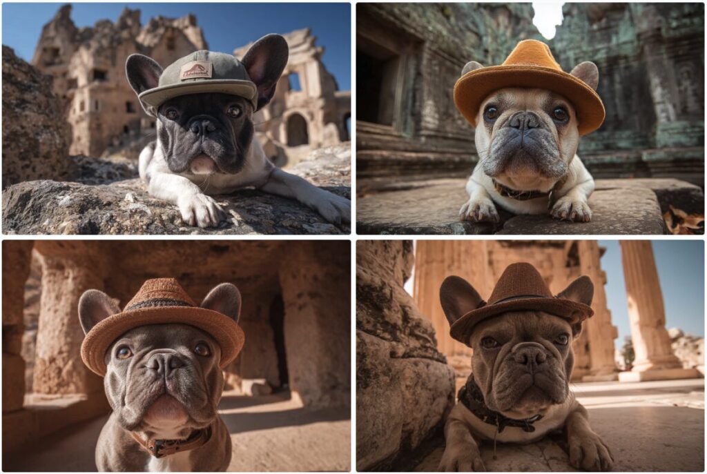 (帽子をかぶったフレンチブルドッグ、古代遺跡)