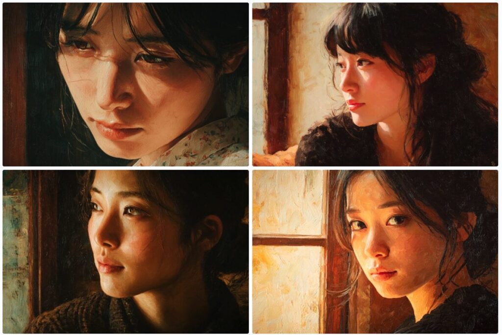(30歳の日本人女性のポートレート、油絵、居心地の良いリビングルーム、窓からの柔らかい光、暖かいアースカラー、平和で瞑想的な雰囲気、クローズアップ構図)