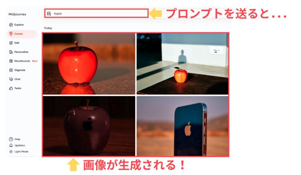 例えばりんごのイラストを描きたい場合、Midjorneyに「Apple」とテキストを送ると、りんごのイラストが生成されます。