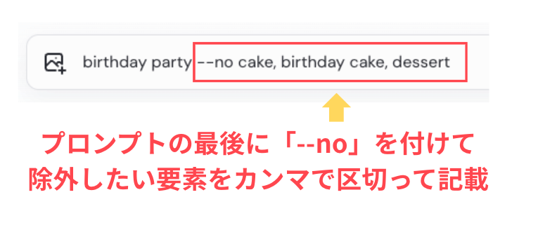 「欲しくないもの」ではなく「欲しいもの」に焦点を当てて記述しましょう。「ケーキのない誕生日パーティー」と書いても、ケーキが表示される可能性があります。特定の要素を除外したい場合は、専用の「–no」パラメータを使用します。